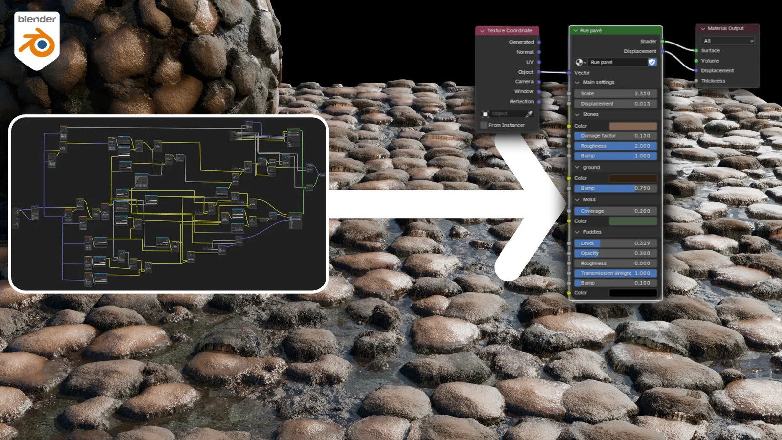 A procedural cobblestone street material built entirely within Blender's Shader Editor. The setup generates height-based details, surface variation, and dirt without the use of external image textures. It includes an integrated puddle system driven by the generated height map, allowing users to adjust the water level across the surface. The node tree is organized for readability, making it suitable for both direct use in scenes and studying procedural material workflows.