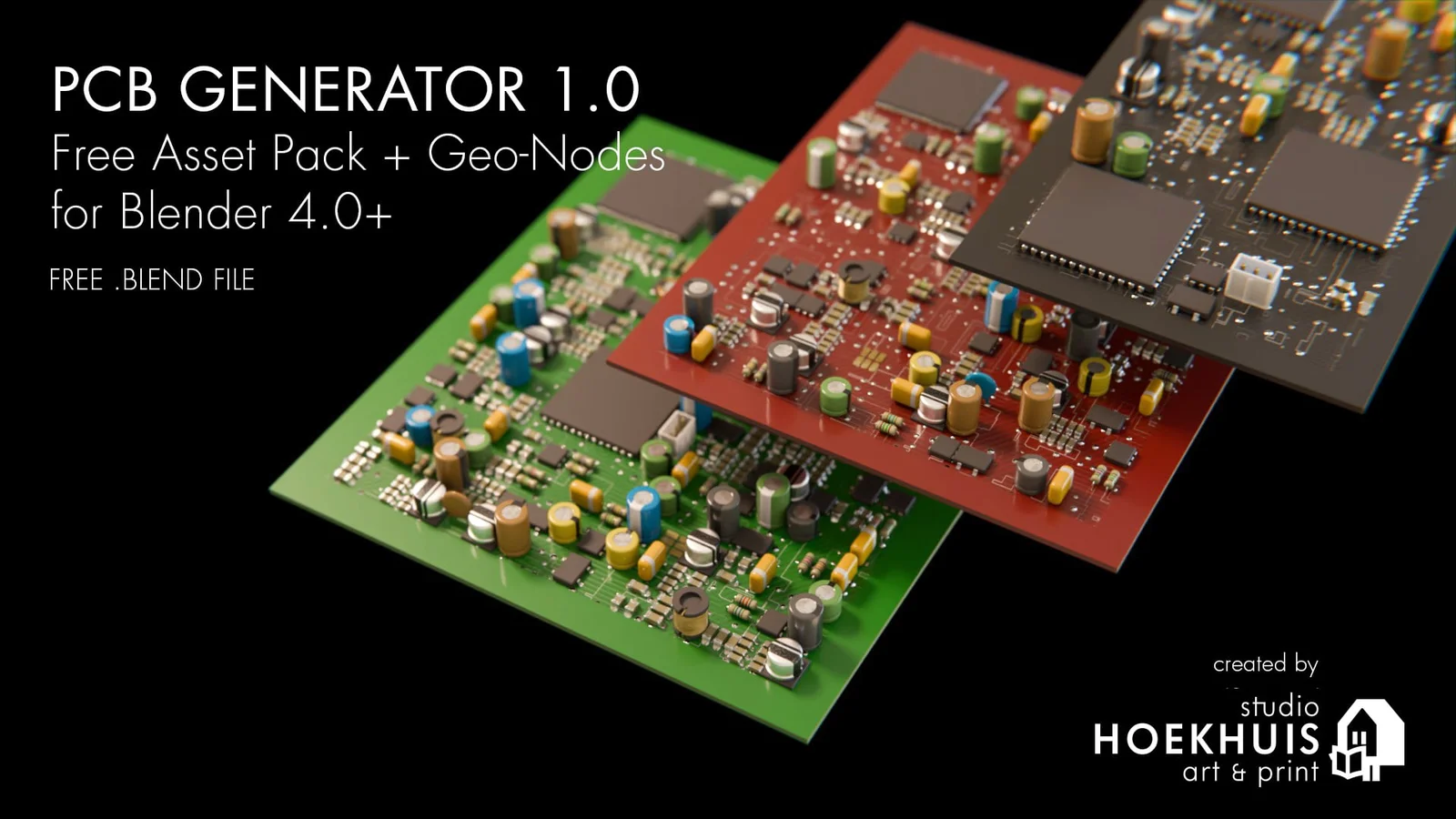 A procedural generator for creating custom circuit boards and motherboards directly in Blender. Built with Geometry Nodes, it allows users to adjust dimensions, border thickness, base color, and component density directly through the Modifier tab. The system populates the board using predefined collections of electronic components categorized by common, rare, and large sizes.