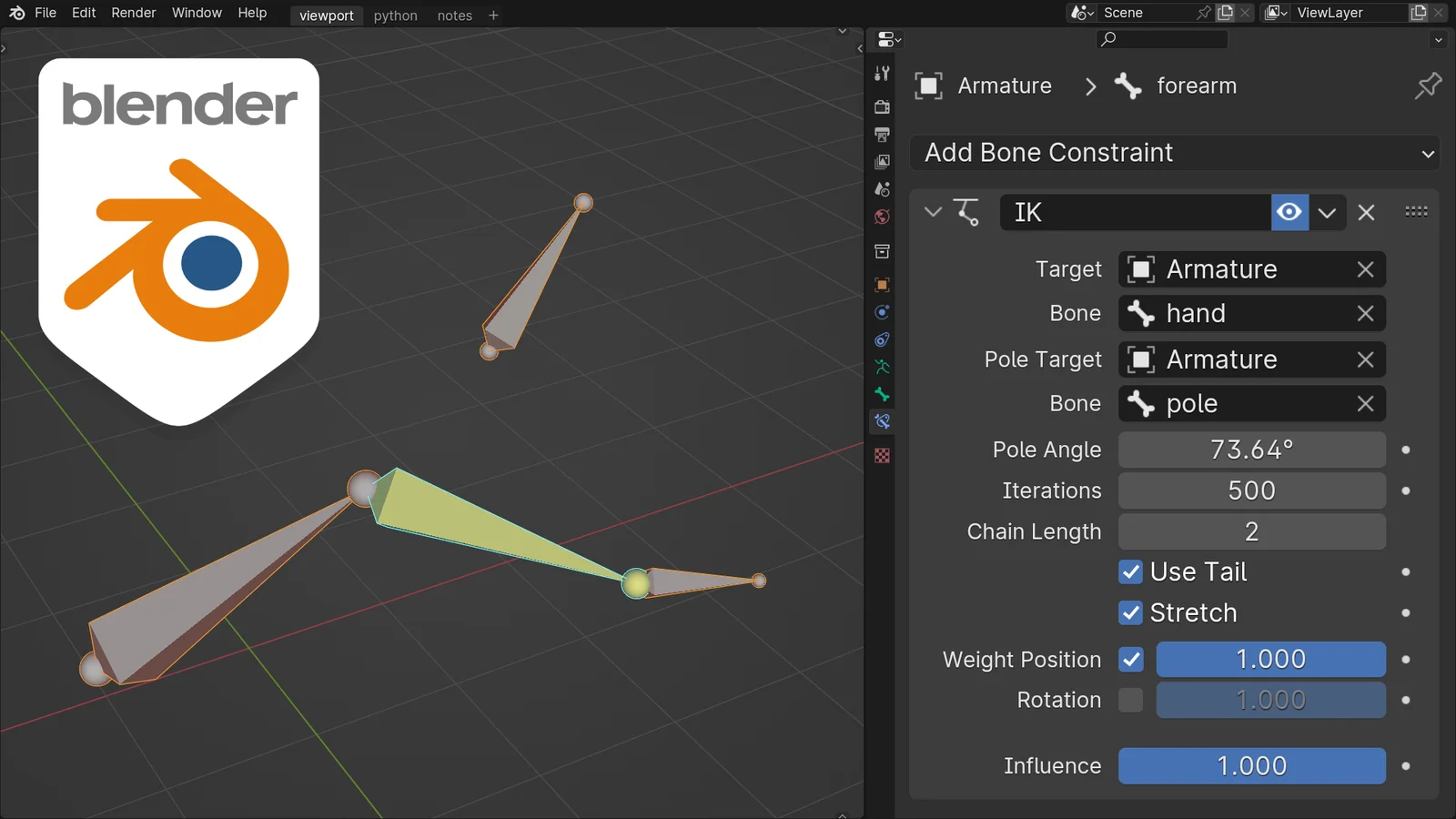 This tool calculates and sets the exact pole angle for inverse kinematic constraints on three-bone IK chains. Users select the pose bone containing the IK constraint and run the operator from the search menu. It accurately calculates the angle so the armature will not shift or rotate when toggling the IK constraint on and off in the rest position.