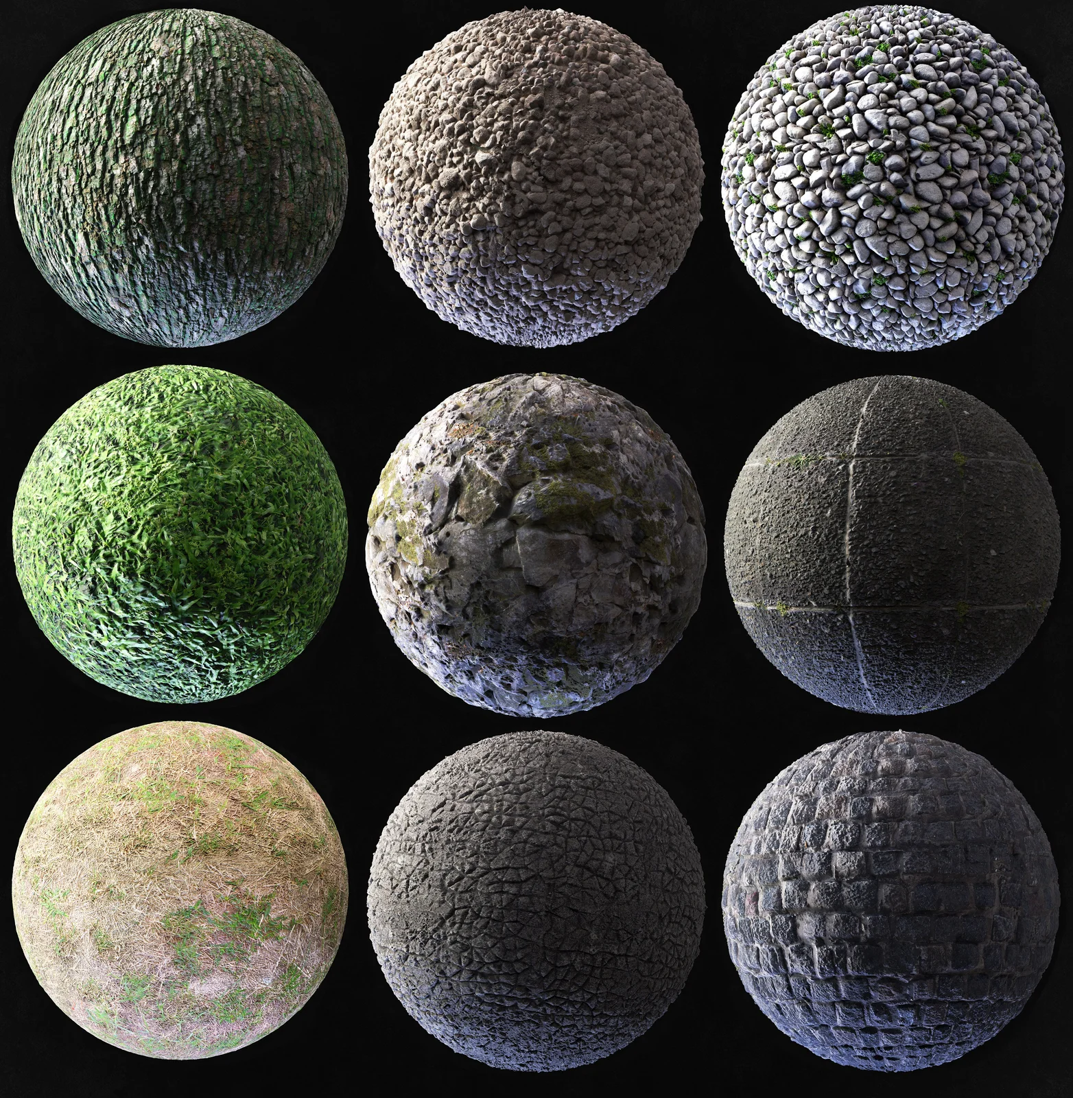 The collection covers various environmental textures, including bark, grass, pebbles, sidewalks, and stone surfaces. A pre-configured Blender file is included to provide immediate access to the materials.