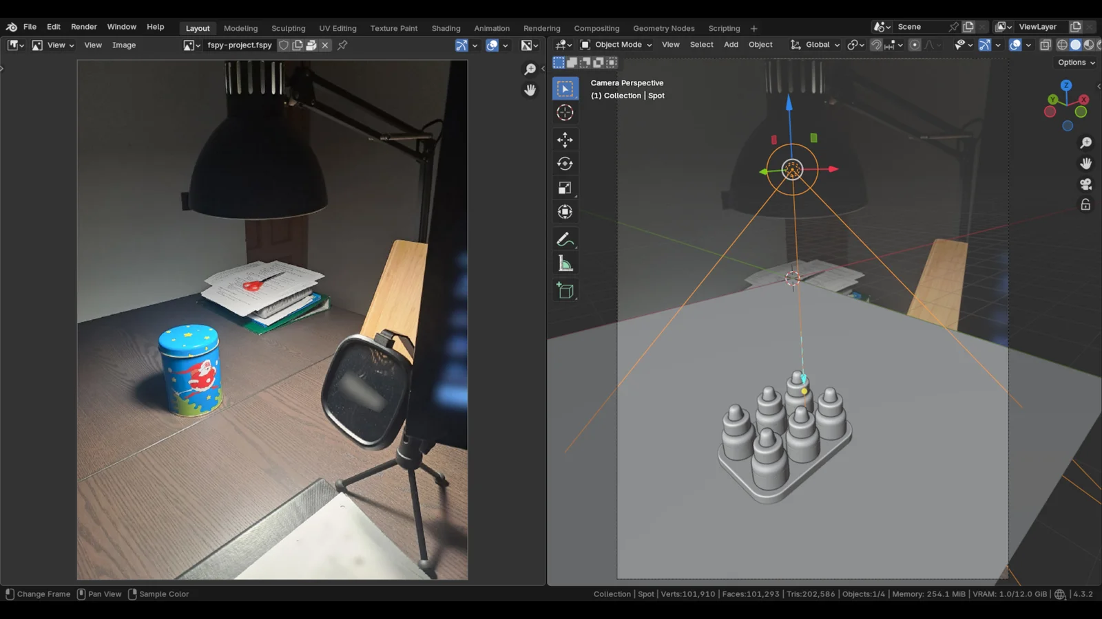 A PDF and video tutorial covering the basics of photo matching in Blender 4.x. The guide explains how to use fSpy to extract camera parameters from a 2D photograph and import them into Blender. This establishes the foundational scene setup for integrating 3D models into real-world images, preparing the scene for shadow catching and compositing workflows.