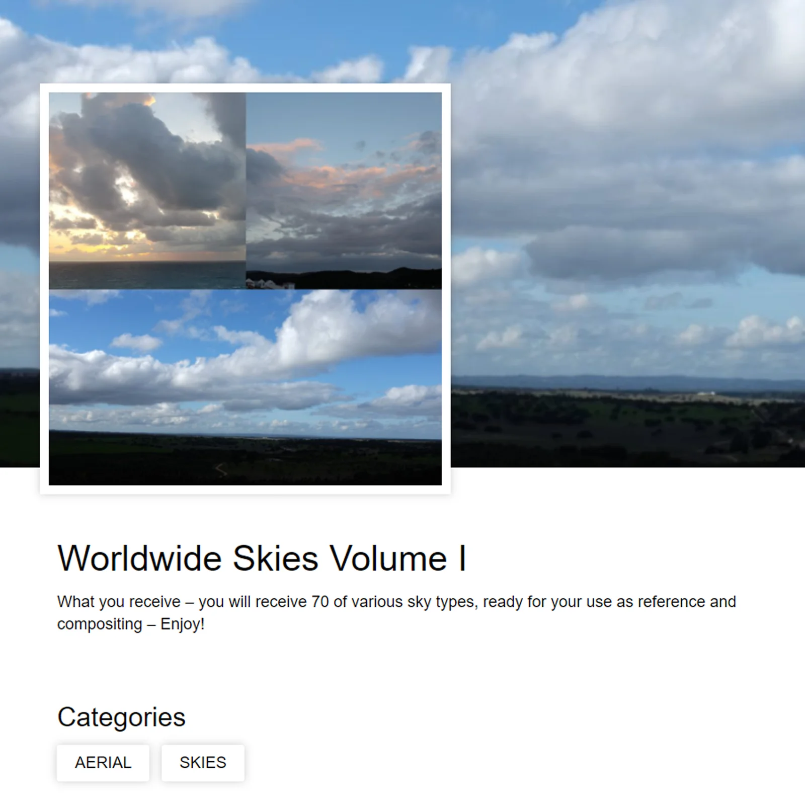 A collection of 70 photographs featuring various types of skies from around the world. These image files are suitable for use as reference material, concept design elements, or background plates for compositing in post-production workflows.