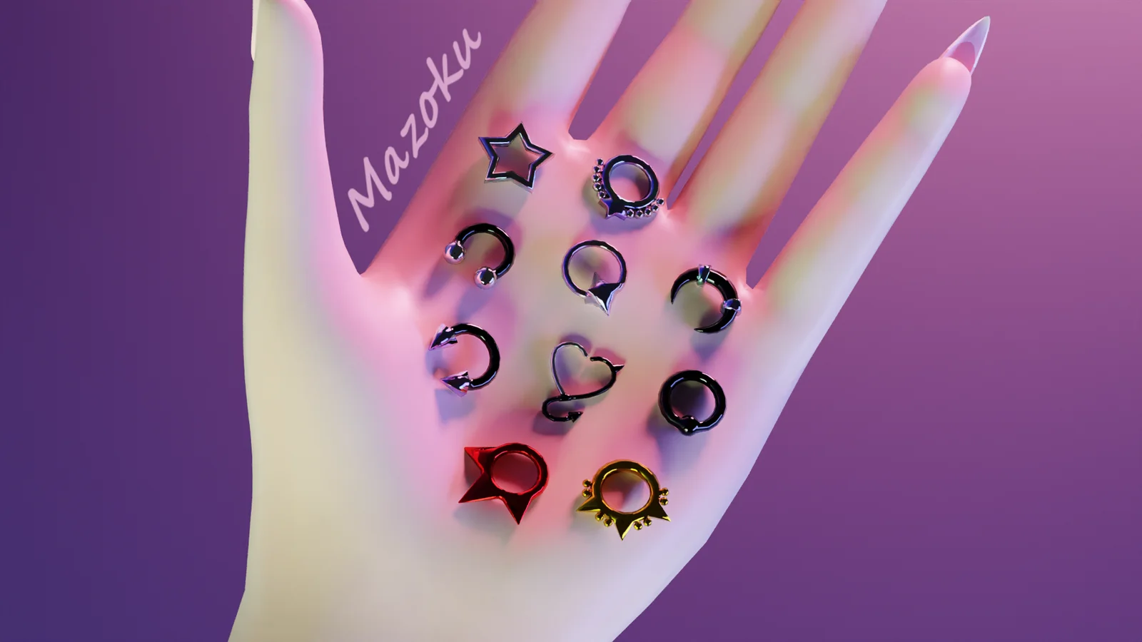 A set of unrigged 3D piercing jewellery models designed for character detailing. The package includes a single FBX file containing all the piercings combined into one object, utilizing a single material slot. It comes with 10 distinct sets of 2K PBR textures created in Substance Painter. The entire jewellery set totals 4,700 triangles.