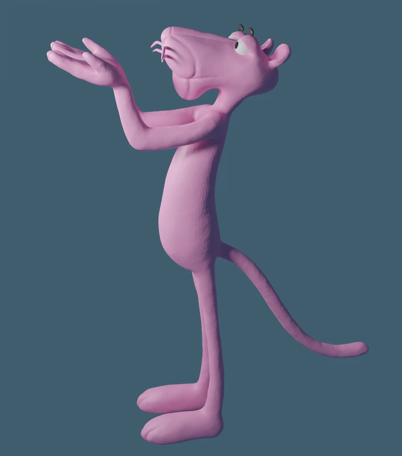 This product provides a high resolution 3D character model of the Pink Panther. The geometry is provided as a dense sculpt and does not rely on Subdivision Surface or Multiresolution modifiers to maintain its shape.