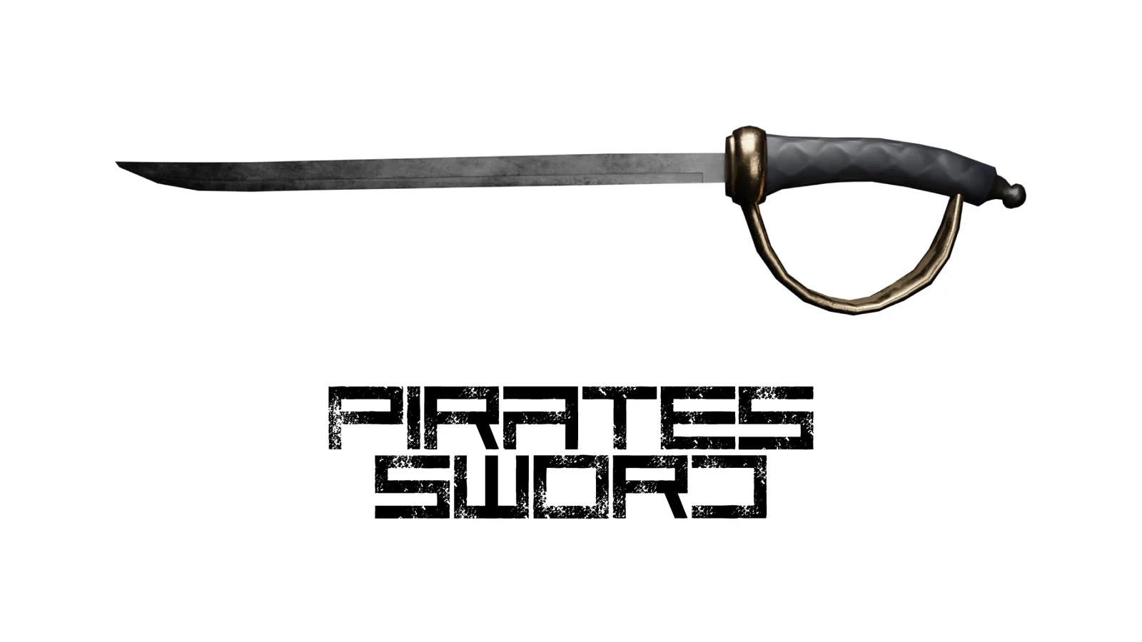A 3D model of a pirate sword, fully textured and UV unwrapped. The model includes both high and low-resolution texture sets to accommodate different workflow conditions. The geometry consists of 734 polygons and 1,430 vertices. Files are provided in multiple standard formats including Blender, FBX, OBJ, DAE, and MTL.