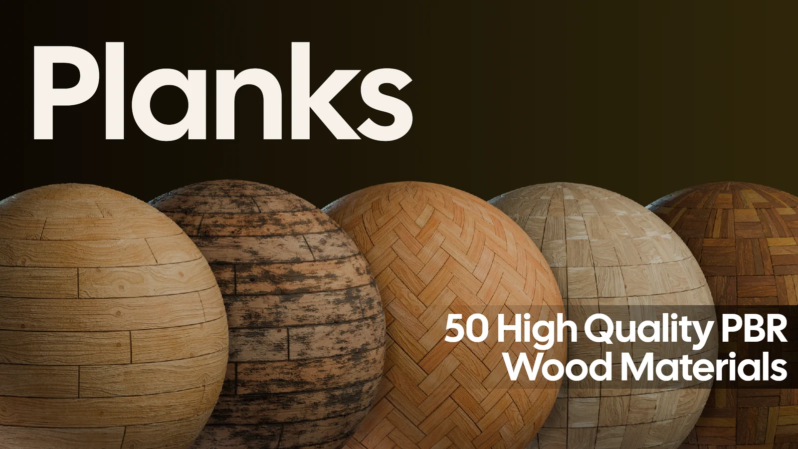 Planks is a collection of 50 physically based rendering (PBR) wood materials designed for environments, game development, and architectural visualization. The package contains 10 distinct wood types, each offering clean planks, worn planks, and three unique parquet variations.