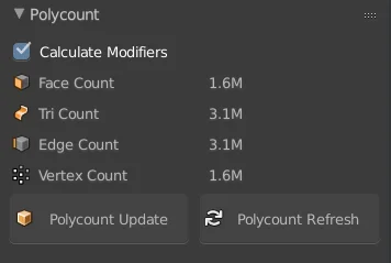 Polycount is an add-on that displays the face, triangle, vertex, and edge counts for the currently selected object. It calculates mesh data while optionally factoring in active modifiers. This allows users to view accurate geometry statistics directly without needing to isolate the object on a separate layer or enter edit mode.