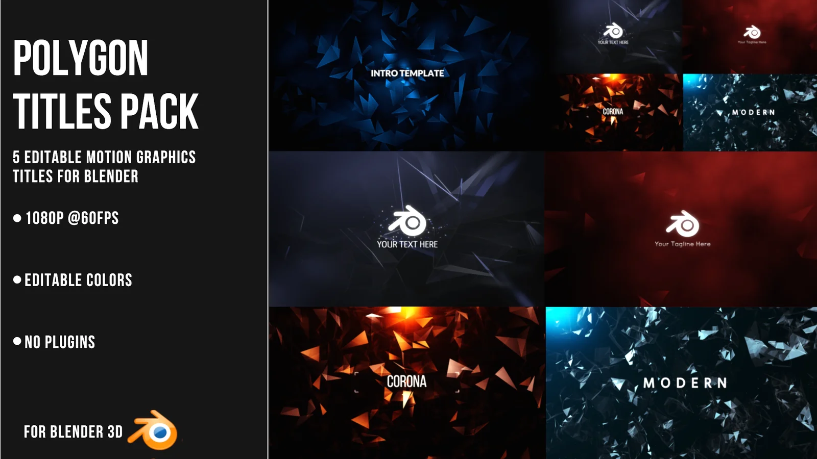 Polygon Intro Pack provides a collection of five motion graphics templates designed for creating stylized intros and logo stings natively in Blender. These ready-to-render scenes require no external plugins and are pre-configured for 1920x1080 resolution at 60 frames per second. A video tutorial is included to guide users through customizing the text, logos, and animations for their own projects.