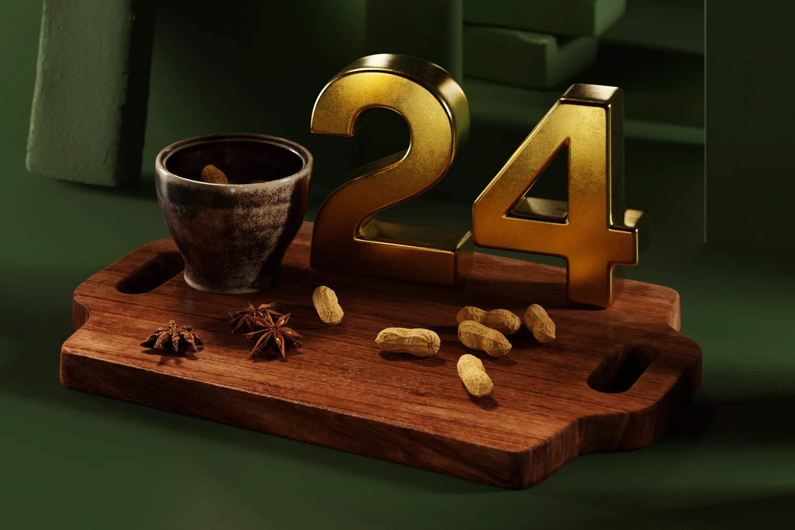 This collection provides four 3D models suited for kitchen and holiday scenes. The included assets are a wooden cutting board, a peanut, a star anise, and a small mewa bowl. The models are available in format-agnostic FBX and OBJ files, alongside files for Cinema 4D and Octane.