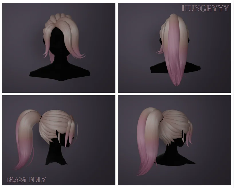 A rigged 3D model of a side-swept ponytail hair style containing 18,624 polygons. The asset is fully UV mapped and designed to be attached to character models or avatars. It is commonly used alongside third-party hair texture packs.
