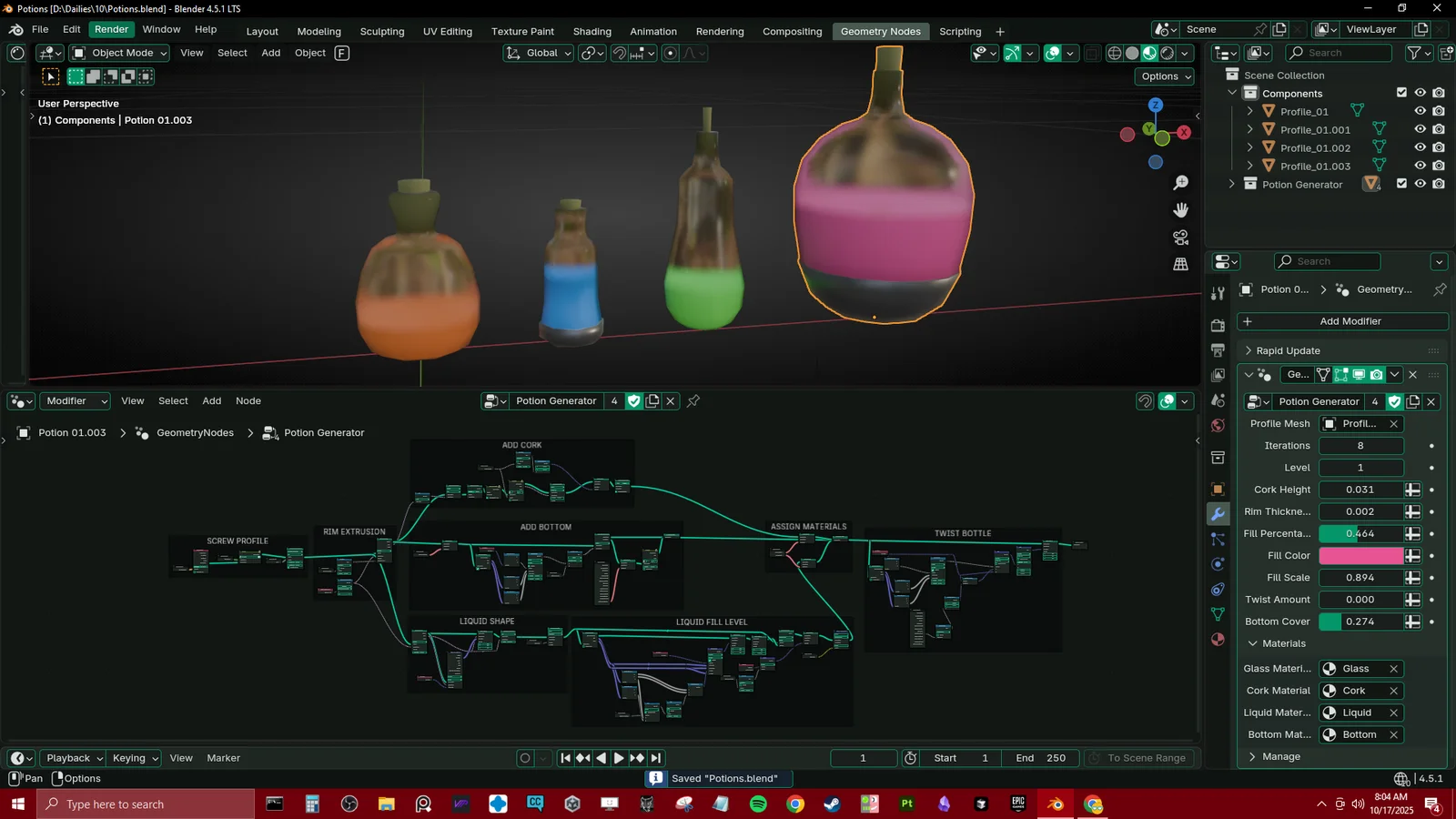 This Geometry Nodes setup generates a variety of bottle and potion shapes based on a simple profile line. Users can draw or adjust the curve profile to define the silhouette of the vessel, with manual controls available for further customization.