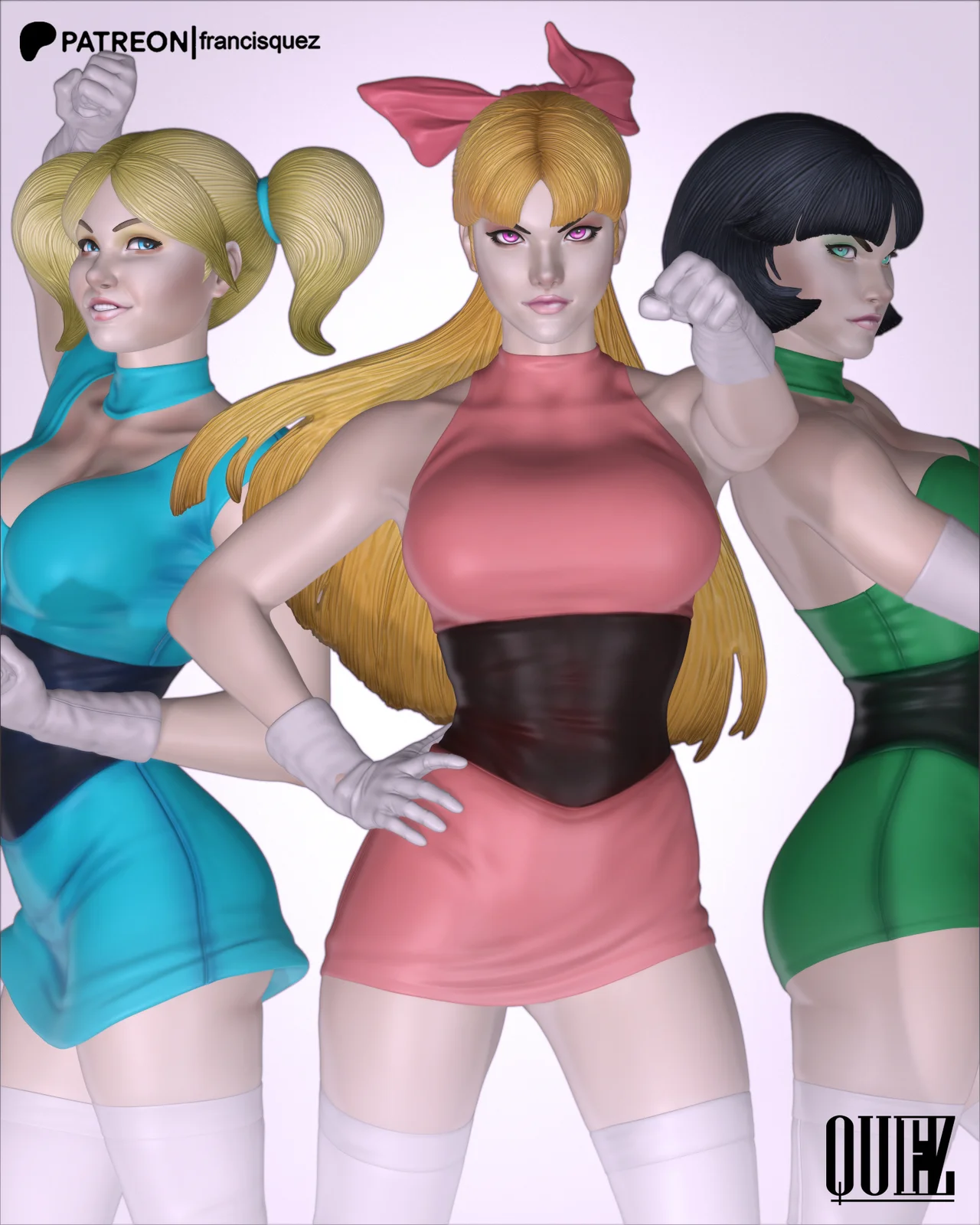 A 1/6 scale digital model of the Powerpuff Girls designed for 3D printing. The model is provided in STL format and stands at a default height of 315mm. The design is based on artwork by Artgerm.