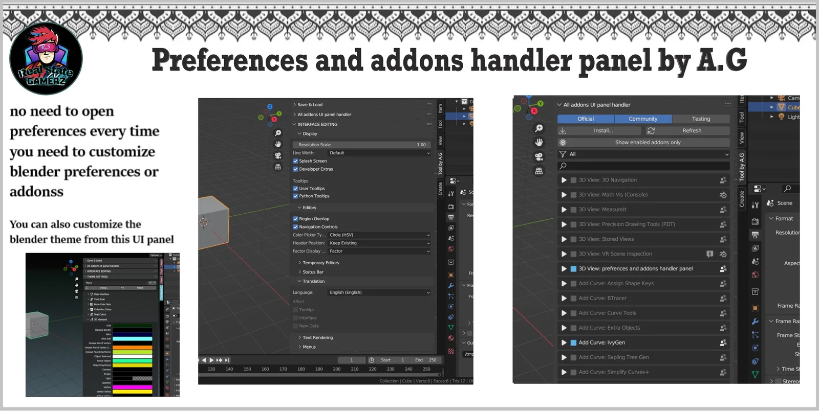 The Preferences and Addons Handler is an addon that exposes a subset of Blender's preference settings directly in the 3D viewport UI panel. It provides tools for importing, enabling, and disabling addons without opening the preferences window.
