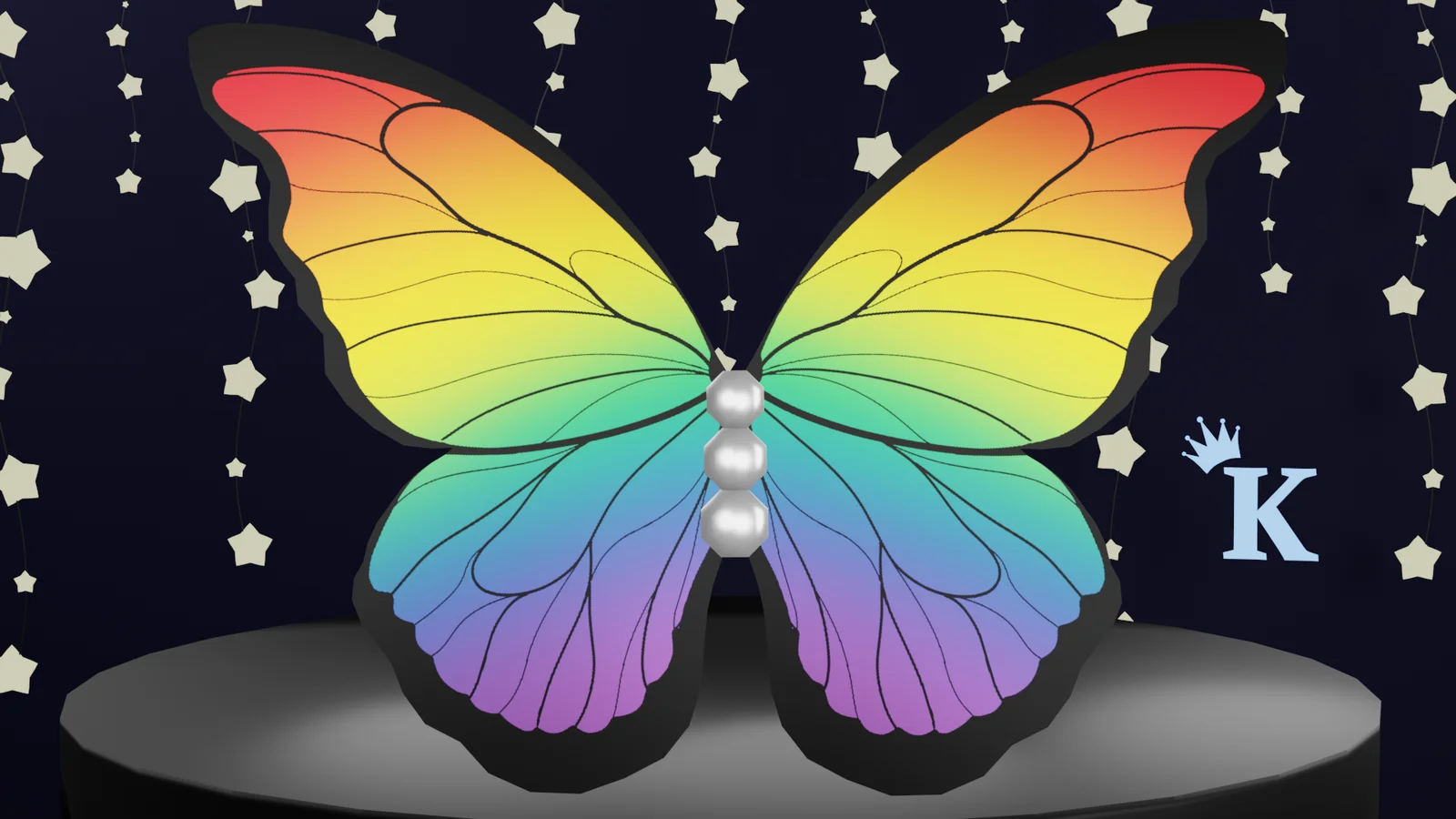This 3D butterfly accessory model includes low-poly (332 polygons) and high-poly (1,910 polygons) variations. The asset is provided in FBX format and includes texture files for various Pride flag colors, a metal mask, and a butterfly outline for creating custom color combinations. The model is unrigged and does not include weight painting.