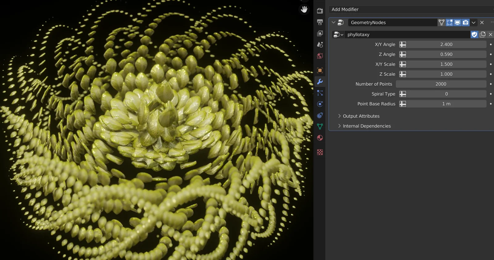 Procedural 3D Phyllotaxis is a Geometry Nodes setup for generating the arrangement patterns of leaf-like appendages found in plants. The product includes two distinct node trees for creating these structures.