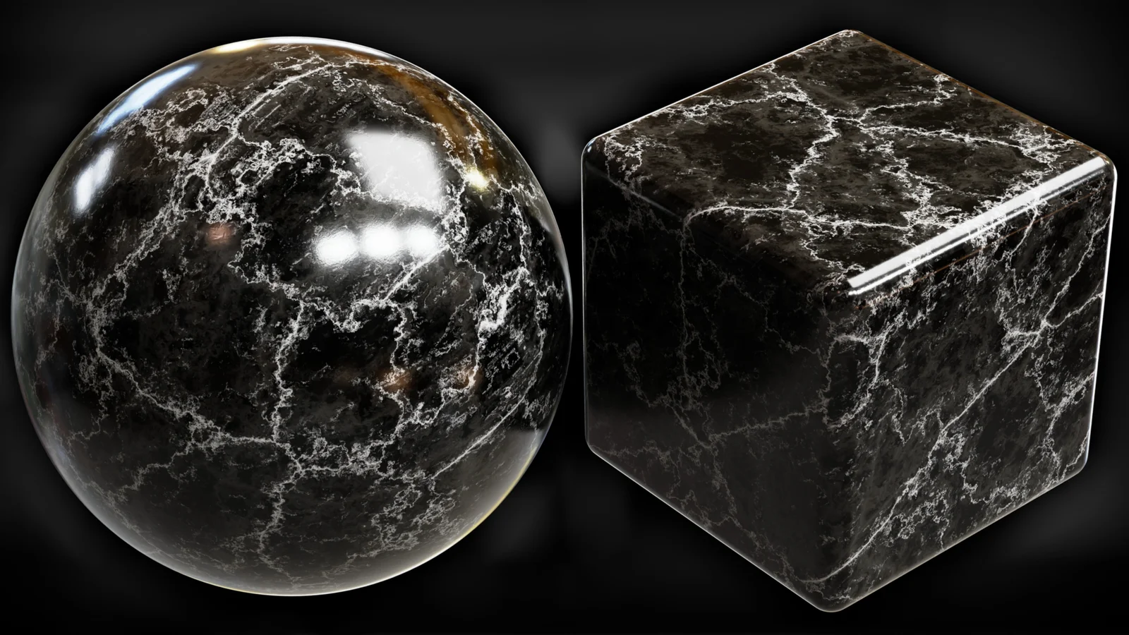 A procedural black marble material built entirely using Blender's procedural native nodes. The shader is structured into a custom node group that exposes key parameters for easy adjustments. Users can control the scale, base and vein colors, fine details, vein distortion characteristics, subsurface scattering, and surface roughness. The package includes the configuration Blender file along with an HDRI environment used for the presentation renders.
