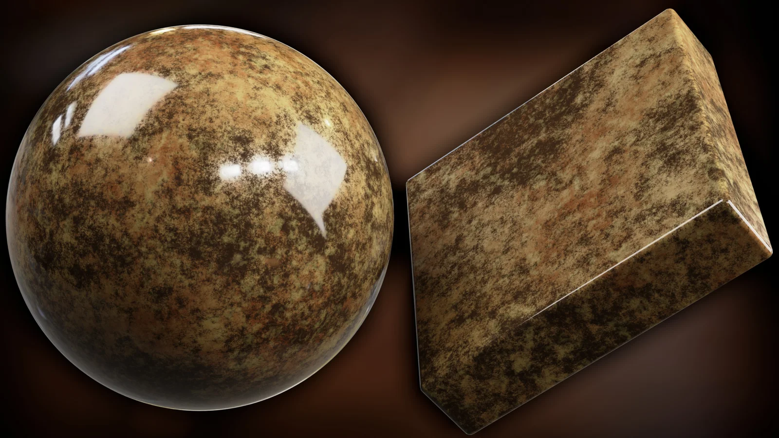 A procedural brown granite material built using Blender's shader nodes. The material is packaged into a custom node group with exposed parameters, allowing users to modify the scale, colors, detail levels, and roughness to fit different scenes. The included Blender file comes with the material setup, final render composition, and HDRI lighting ready for use.
