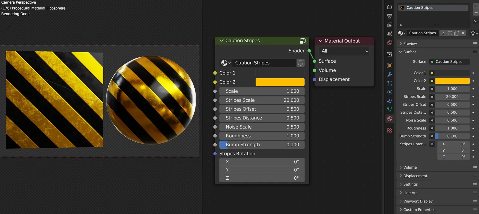 A procedural caution stripe material built using Blender's shader nodes. The material is consolidated into a custom node group that provides dedicated controls for adjusting the scale, colors, roughness, bump depth, and stripe offset. The package includes the Blender source file with the material setup, final render images, and the HDRI used for lighting.