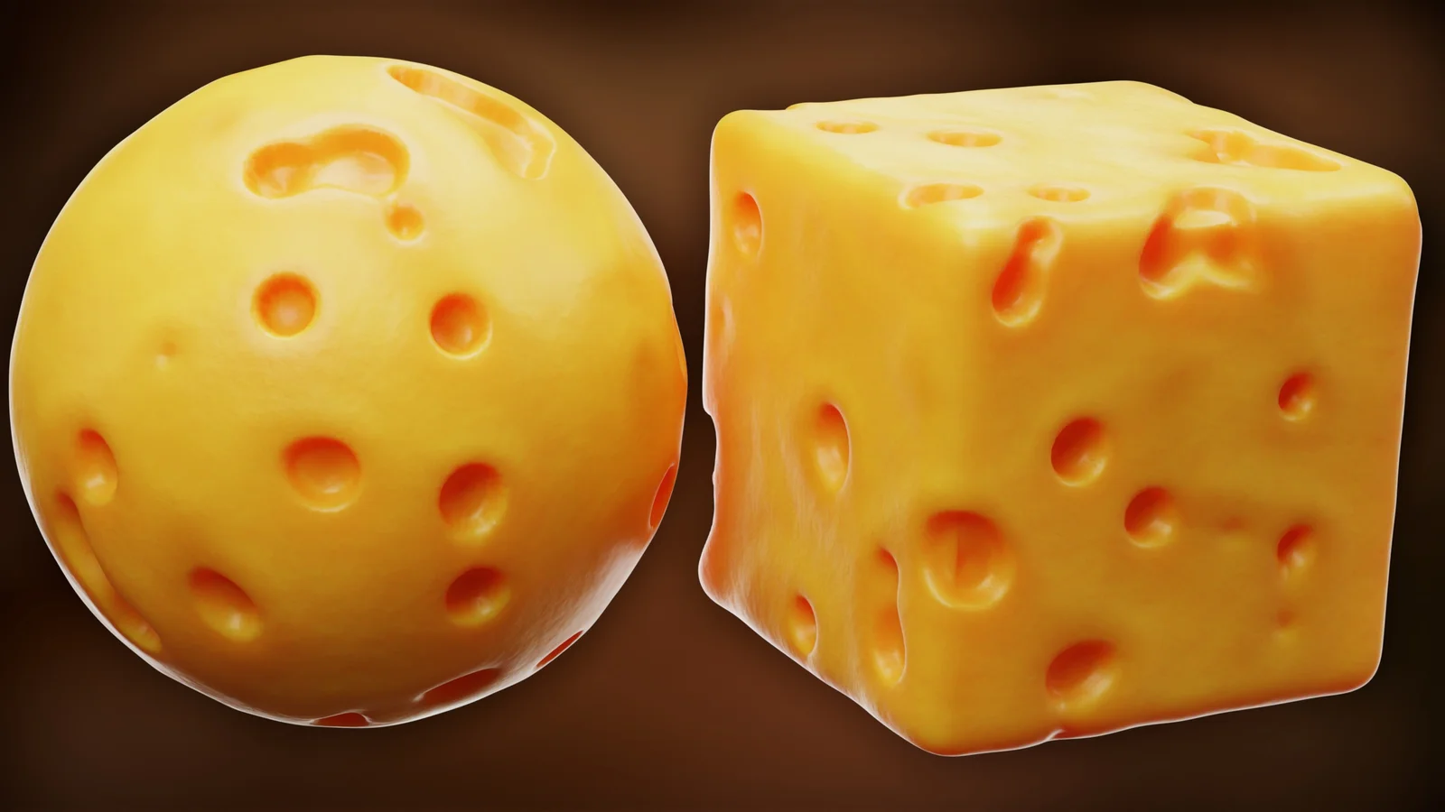 A procedural cheese material built using Blender's shader nodes. The setup is contained within a custom node group, offering exposed parameters to adjust scale, colors, roughness, subsurface scattering, and bump strength. The product includes two distinct versions: one utilizing true displacement for detailed high-poly objects, and a bump-only alternative designed for lower-poly meshes.