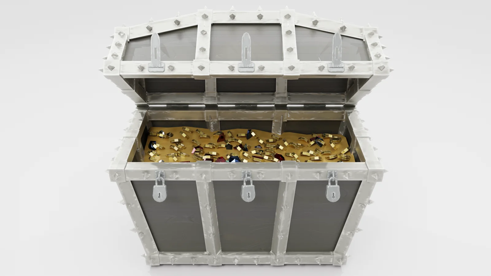 Procedural Chests is a geometry nodes setup for generating and customizing 3D chest models in Blender. The tool provides controls for modifying both the base and lid shapes, including adjustable lid slopes. It generates associated hardware such as procedural handles, hinges, locks, and customizable clasps.