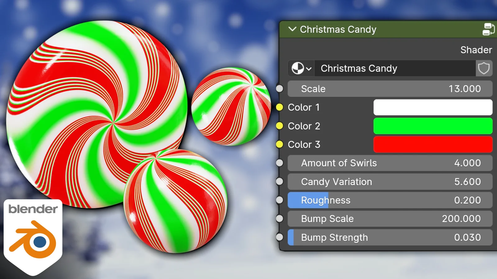 This procedural material generates customizable Christmas candy surfaces for 3D objects. The shader is packaged into a custom node group, providing users with adjustable settings to control the final appearance of the candy. The download includes the source Blender file, final renders, and the HDRI lighting setup used in the developer's demonstration.