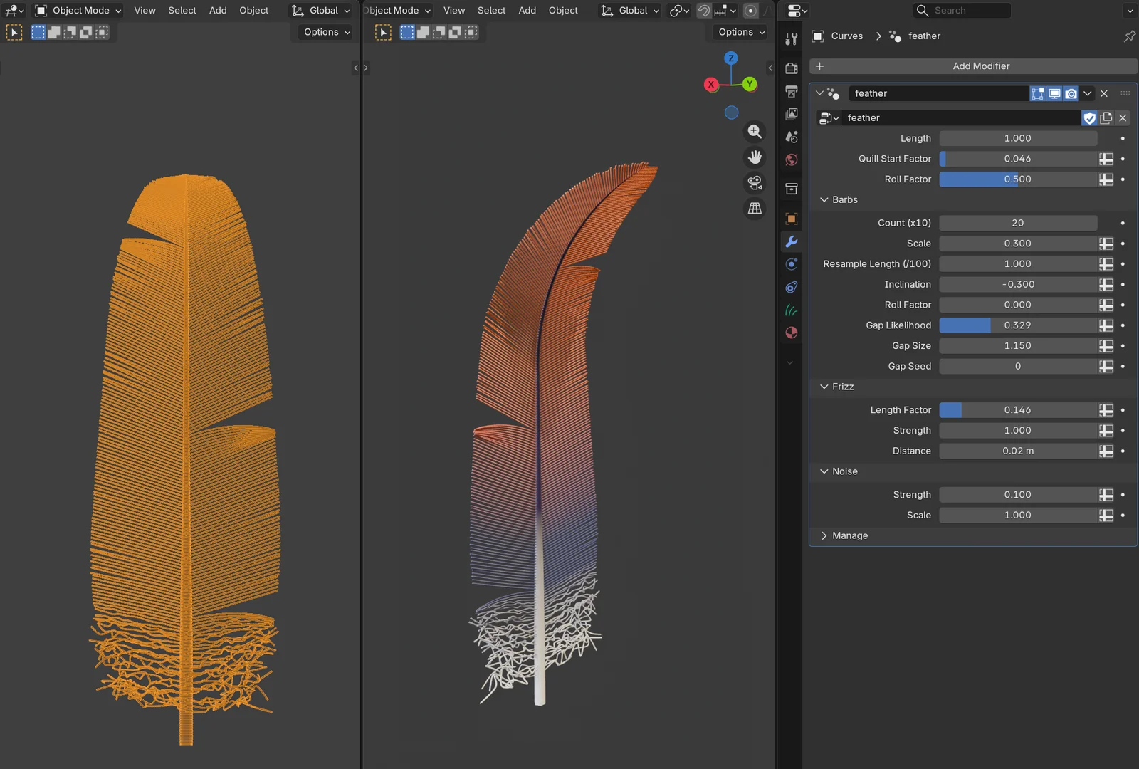 This Geometry Nodes setup provides a procedural system for generating custom feathers within Blender. The included modifier allows users to create customizable feather geometry without relying on manual modeling or external textures.