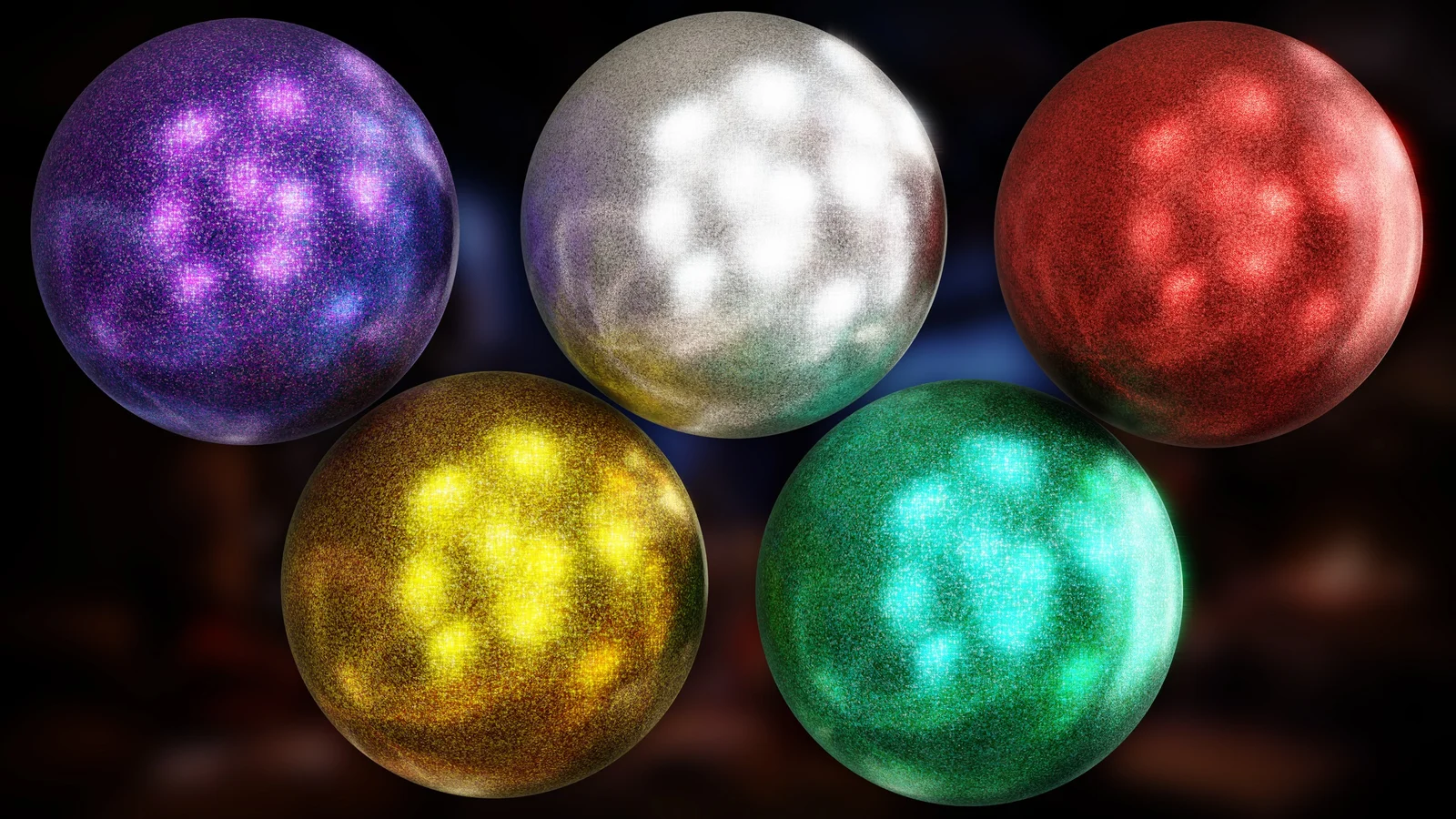 This procedural glitter material is built using Blender's shader nodes. It generates a sparkling surface effect entirely procedurally, without the use of external image textures. The material comes equipped with ten pre-configured color variations, including silver, gold, peppermint, and colorful white, alongside an option to input a custom hue. The included project file also contains the HDRI lighting setup used to illuminate the material in the preview renders.