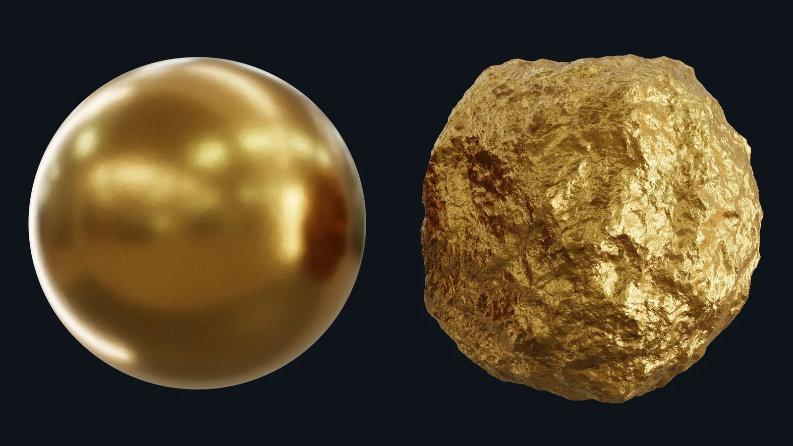 A procedural gold material created using Blender's procedural shader node system. The package provides a complete Blender project file containing the node setup, along with final renders and the HDRI lighting environment used for the presentation scene.