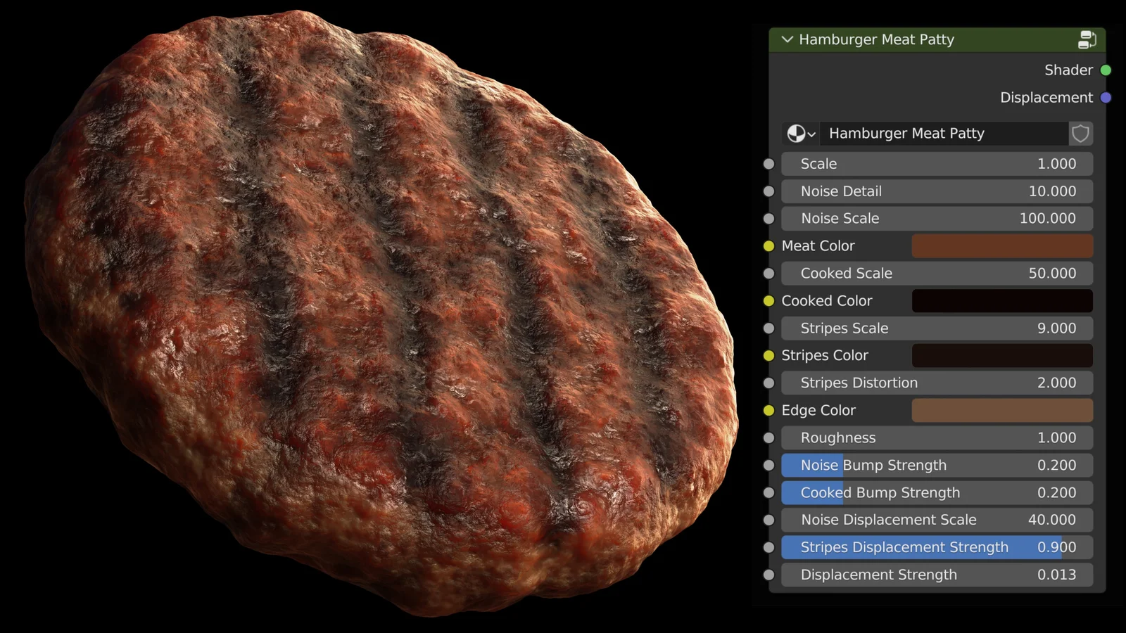 A procedural hamburger meat patty material generated entirely through Blender's shader nodes. The material is consolidated into a custom node group, providing users with adjustable settings to modify the visual characteristics of the meat surface. The package includes the original Blender project file and an HDRI for immediate scene lighting.