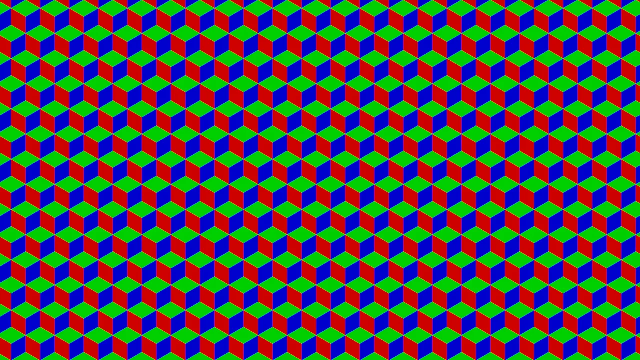 This procedural shader generates a tessellated hexagonal pattern. Each hexagon is internally divided into thirds and colored red, green, or blue. This allows the material to act as an RGB mask for straightforward channel separation and downstream material adjustments.