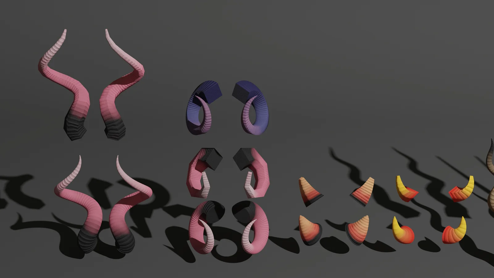 This geometry nodes setup generates customizable horns for creature and character design. The system allows users to adjust the geometry resolution, scaling from performance-friendly low-poly models to highly detailed meshes. The asset includes several pre-configured example horns and textures to provide starting points for custom designs.