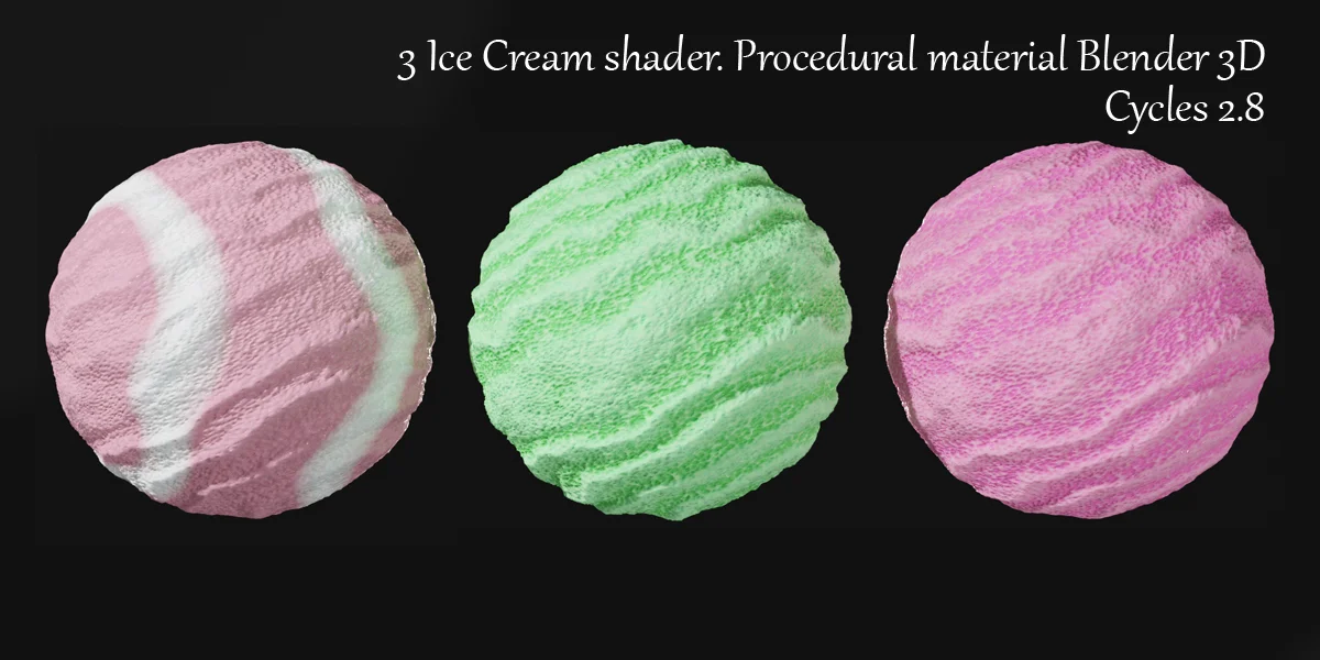 A collection of three procedural ice cream materials designed for Blender and the Cycles render engine. These materials do not require UV mapping and use local texturing and displacement to generate realistic surface details. Users can adjust the colors to create different flavors and appearances for food visualization and still life scenes.