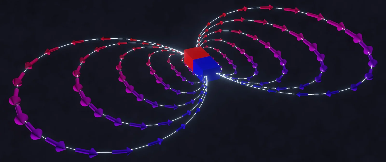 This geometry nodes setup generates an animated procedural magnetic field in Blender. Powered by a custom vector viewer group node, the project provides configurable controls over the field lines. Users can adjust the resolution, line count, curve radius, and animation speed. The system also includes an attractor object input to draw field points closer and allows for instancing directional arrows along the curves to visualize the vector flow.