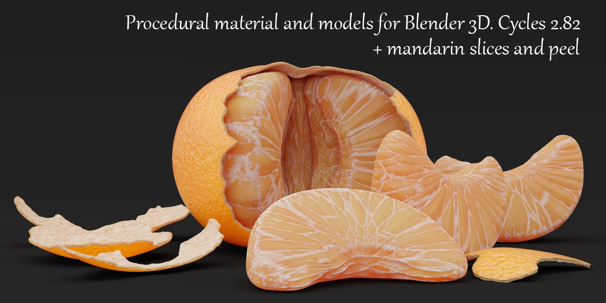A collection of 3D models and procedural materials for rendering mandarin oranges. The asset pack includes geometry for a whole mandarin, a torn peel, and individual fruit slices. The accompanying procedural materials do not require UV maps and feature customizable node setups for the outer peel, inner peel, and slices. Users can adjust parameters such as base color, gloss, spot scale, dot scale, and relief strength to create various citrus fruit variations. Designed for the Cycles render engine.