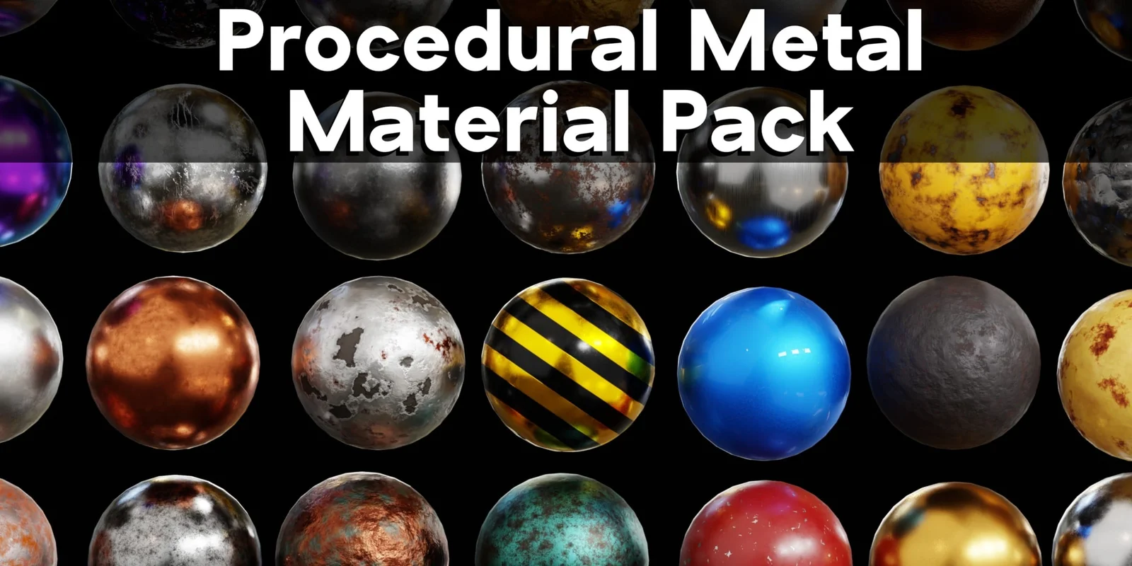 This collection provides 36 realistic procedural metal materials designed for Blender. The materials cover a wide range of surfaces including brushed metals, heavy rust, chipped paint, sci-fi panels, and precious metals like gold and copper. Each material is contained within a custom node group, allowing users to adjust properties such as scale, rotation, color, roughness, bump, and displacement.