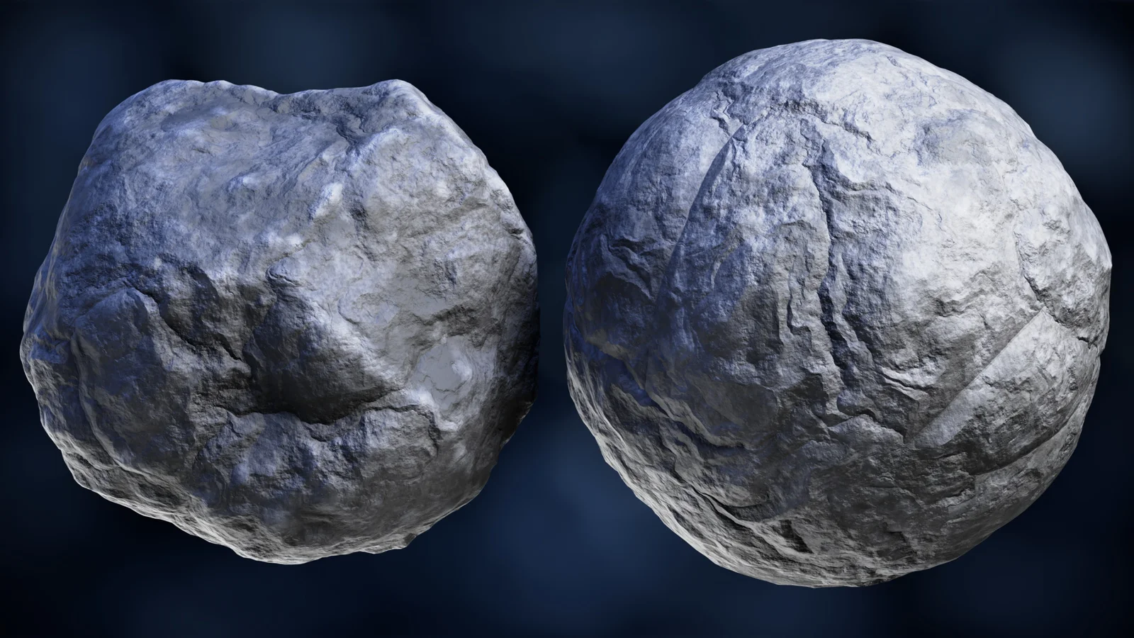 A procedural rock material built using Blender's shader nodes. The material is organized into a custom node group, providing direct access to adjustable parameters. Users can modify settings such as scale, color, noise characteristics, roughness, distortion, detail level, and bump strength to customize the appearance of the rock surface. The product includes the Blender setup alongside a final render configuration and HDRI lighting.