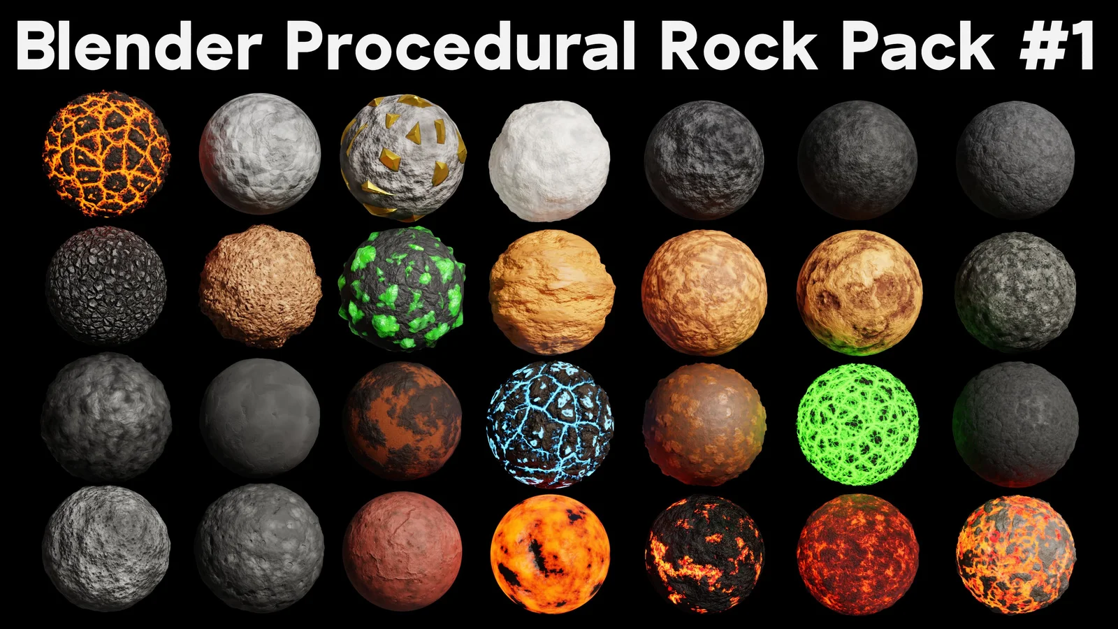 This collection provides 28 procedural rock materials designed for use in Blender. Each material is built as a custom node group, allowing you to easily adjust parameters such as scale, color, distortion, noise settings, roughness, normal, and displacement.