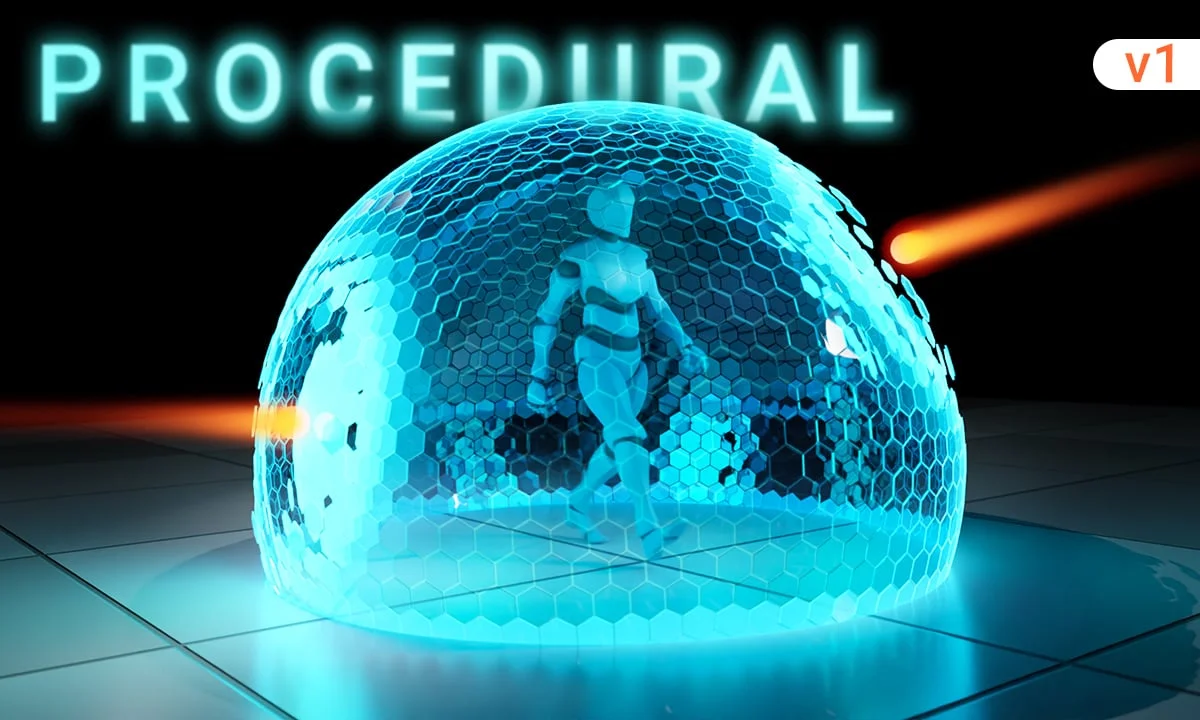 A pack of procedural sci-fi shield effects for Blender. The setup features impact reactions, energy absorption and dissipation visuals, custom reveal controls, and ground deletion to cleanly blend the shield base. It includes two custom material variations: a hexagonal pattern shield and a distorted sphere shield.