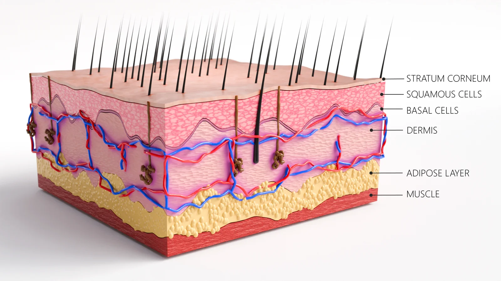 This Geometry Nodes modifier procedurally generates cross-sectional illustrations of human skin. It provides controls to add and modify different skin layers, adjust their surface structures, and distribute anatomical elements including hair follicles, sweat glands, and fat cells. The setup is designed specifically for creating simplified schematics and educational diagrams.
