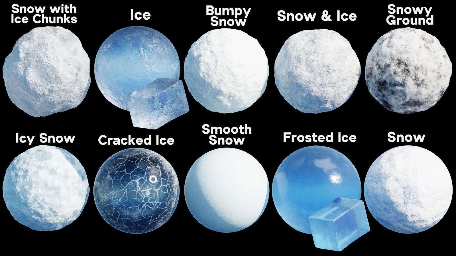 This collection includes 10 procedural snow and ice materials built natively in Blender. Each material is structured as a custom node group, providing adjustable parameters for scale, rotation, color, detail levels, distortion, noise settings, roughness, normal matrices, bump, and displacement.