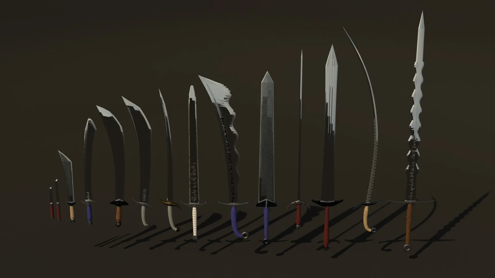 A geometry nodes system that generates a wide variety of procedural swords and knives. Users can customize individual weapon components, including blades with adjustable fullers, curvature, and engravings. The setup also provides controls for generating different styles of handguards, handles, and pommels. Several materials are included to texture the distinct components of the generated weapons.