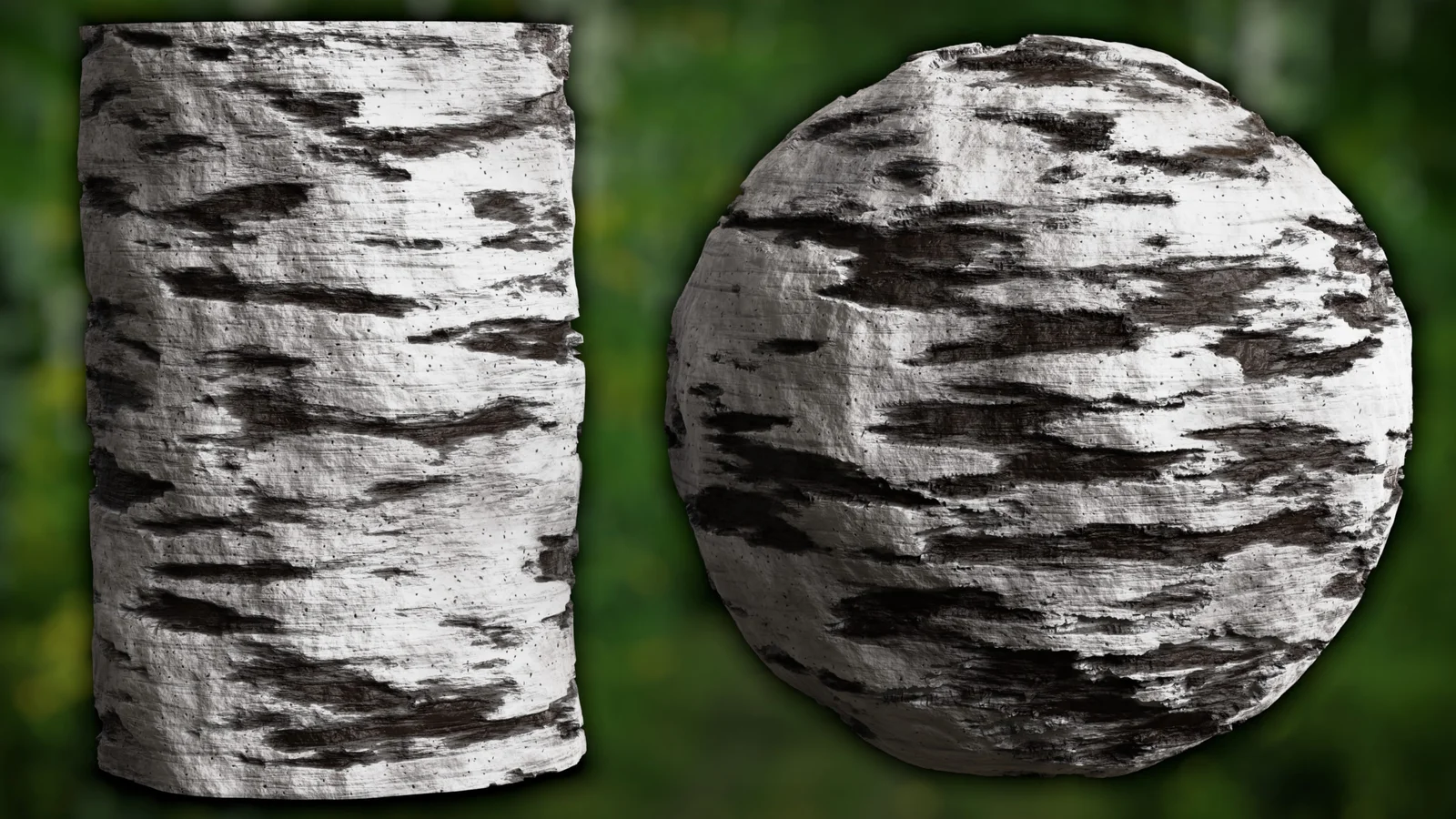 A procedural white birch tree bark material built entirely using Blender's shader nodes. The material is encapsulated in a custom node group that exposes several parameters for customization. Users can adjust the scale, primary colors, bark patches, structural details, surface distortion, roughness, and bump intensity to fit their specific models. The package includes the source Blender file along with the HDRI lighting setup used in the preview renders.