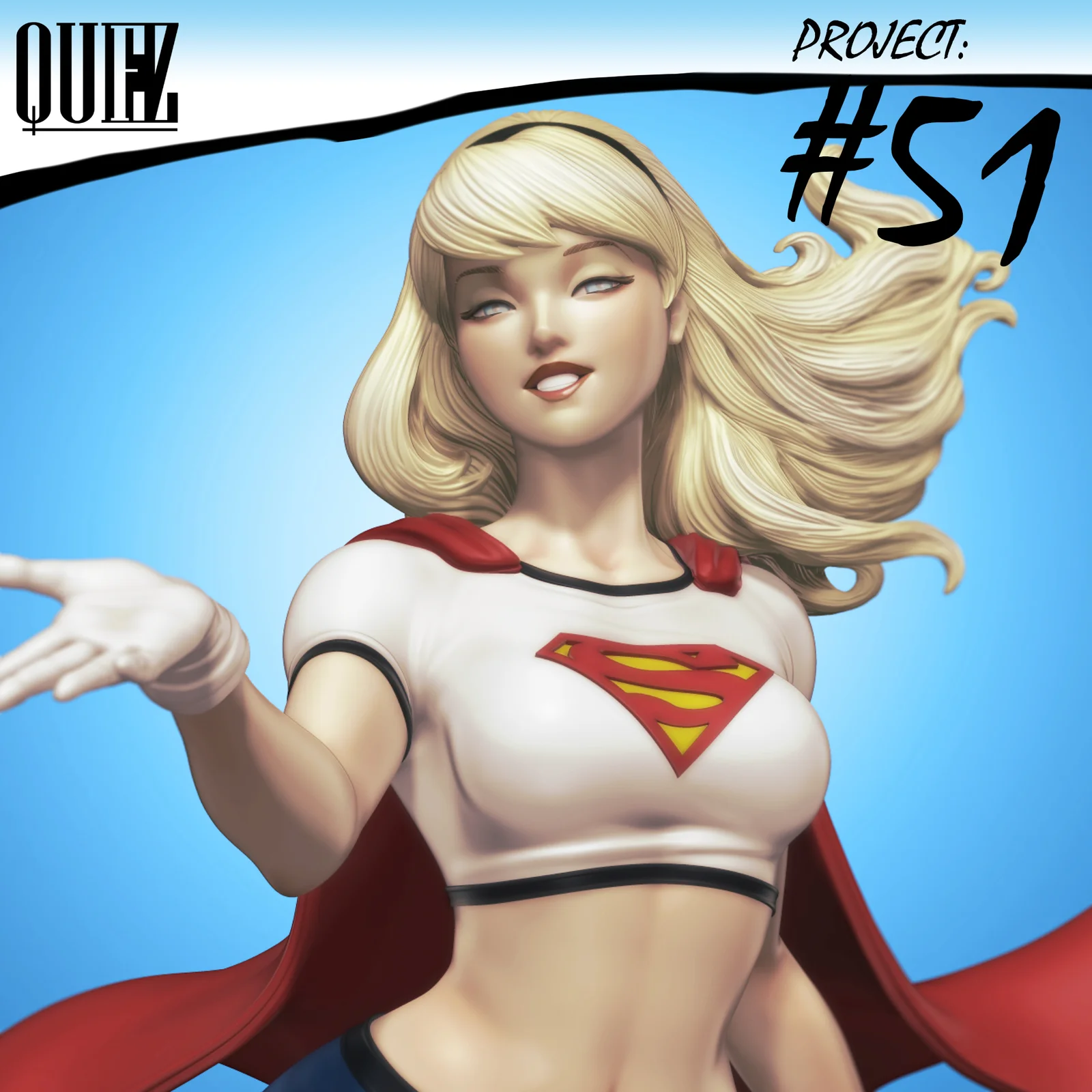 A 1/6 scale 3D printable character model of Supergirl from the animated series, inspired by the art style of Stanley Lau. At its intended scale, the character stands roughly 289mm (11.4 inches) tall. The geometry is provided in STL format, making it compatible with standard slicing software for 3D printing preparation.