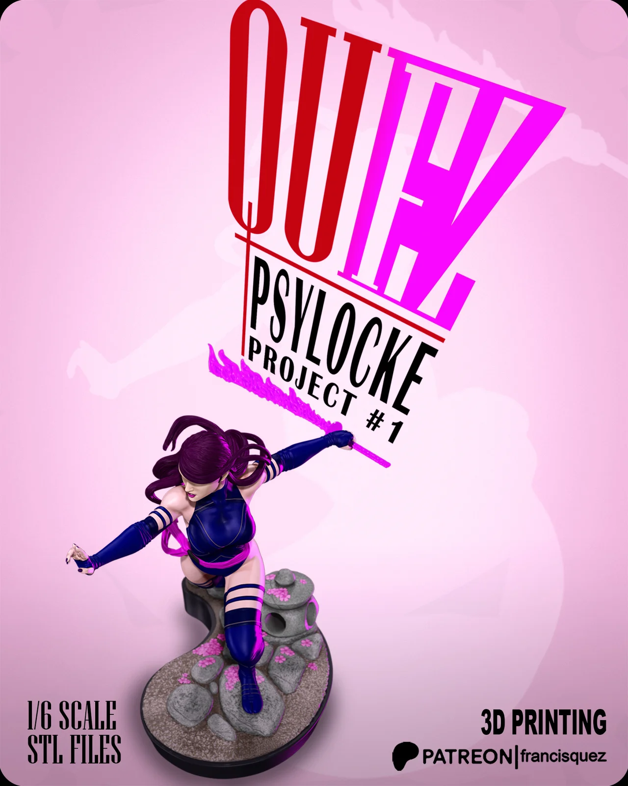 A digital 3D printable model of the character Psylocke. Designed at 1/6 scale with an approximate height of 300 millimeters, this character sculpt is intended for physical reproduction. The model is provided in STL format, allowing users to import it into slicing software to adjust the scale and prepare it for 3D printing.