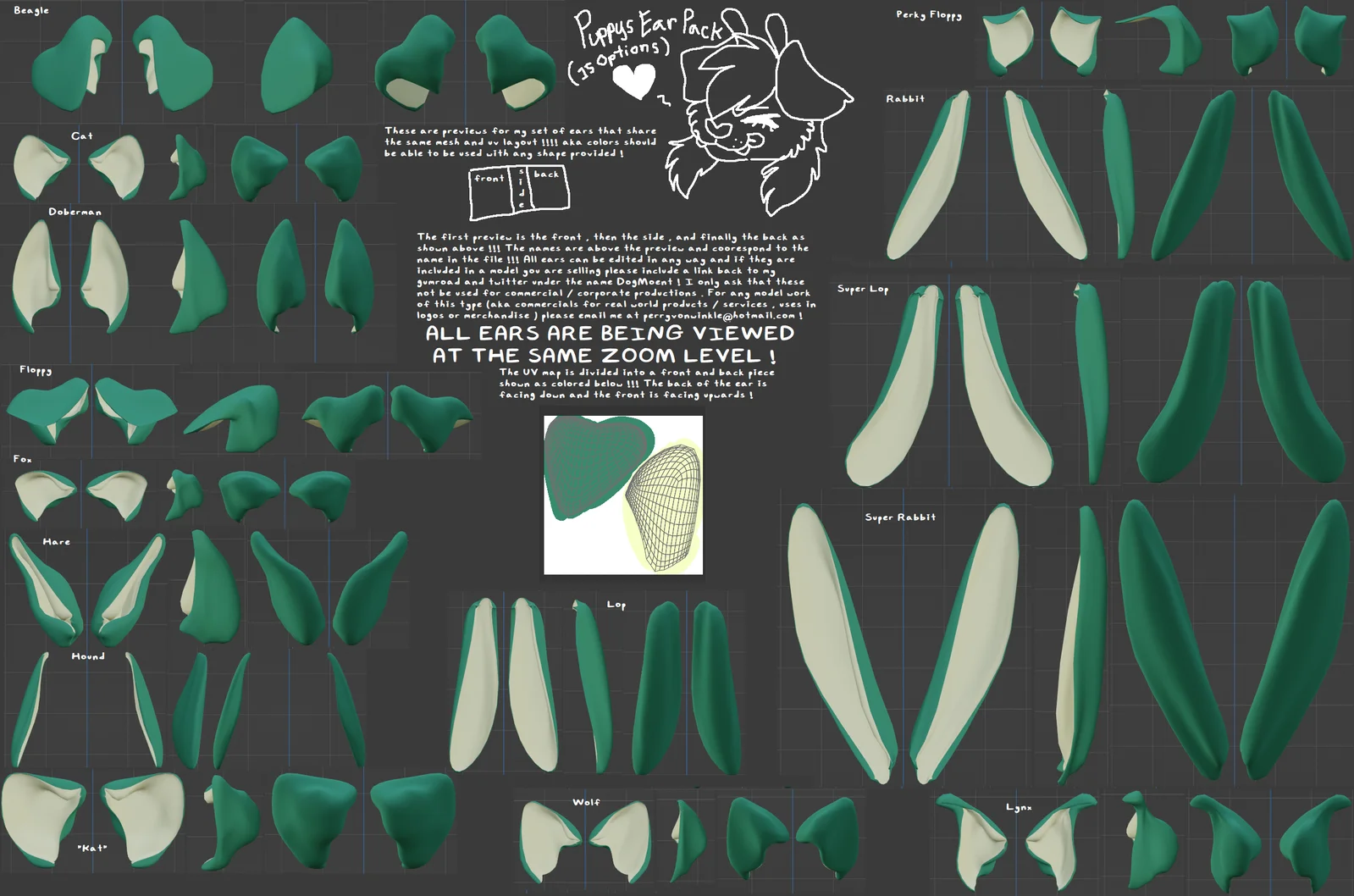A collection of 15 distinct animal ear 3D models provided in a single Blender file. The pack includes various styles such as beagle, doberman, wolf, fox, cat, lynx, hare, and rabbit variations. All 15 models share the exact same base mesh and UV map, allowing for seamless swapping and texture sharing across different ear types. Each ear set consists of 1,748 polygons. The download includes the .blend file alongside a transparent UV layout grid and a default base texture.