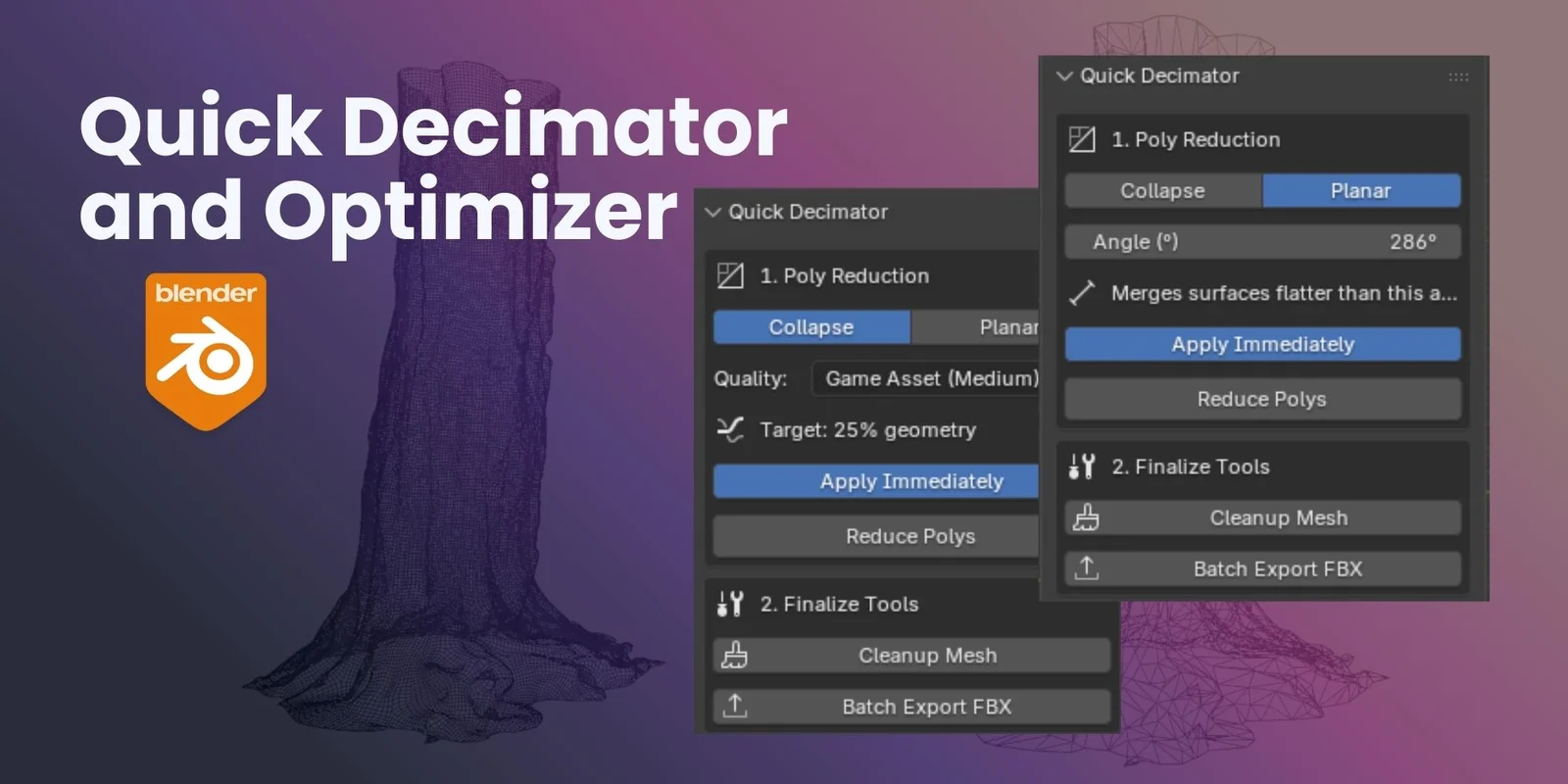 Quick Decimator Optimizer is an addon that centralizes polygon reduction, mesh cleanup, and model export operations into a dedicated sidebar panel. It is designed to quickly prepare 3D assets for use in game engines, augmented reality, and web-based applications by automating repetitive preparation tasks.