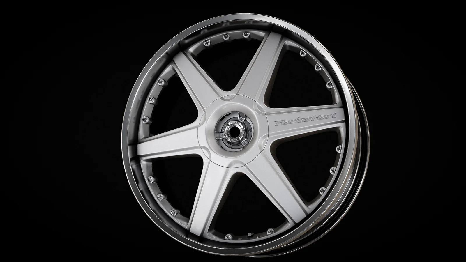 A 3D model of a Racing Hart CR wheel. The asset was modeled in Blender and consists of 233,000 polygons, with textures created in Substance Painter.