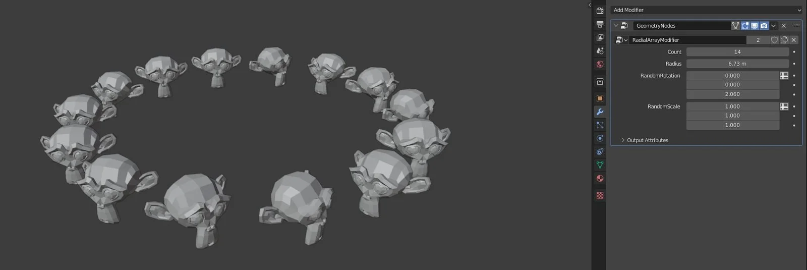 A Geometry Nodes modifier designed to replicate radial array functionality in Blender. The node setup distributes geometry in a circular pattern and includes built-in parameters for applying random rotation and scale to each individual instance.