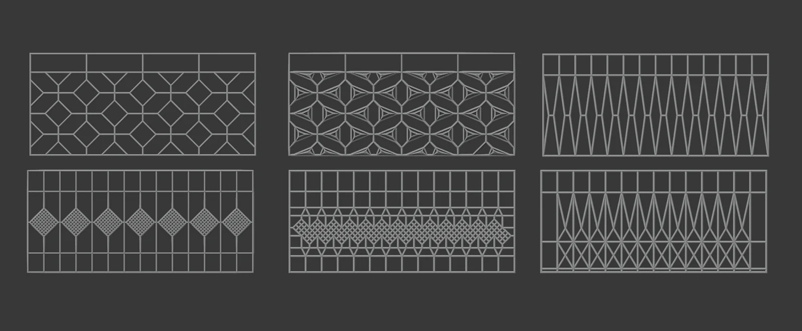 A collection of six railing designs intended for architectural visualization and scene detailing. Each model is built using a wireframe modifier, providing a lightweight mesh structure that can be easily customized. The assets are provided without textures or shading, allowing them to be adapted to different rendering workflows.