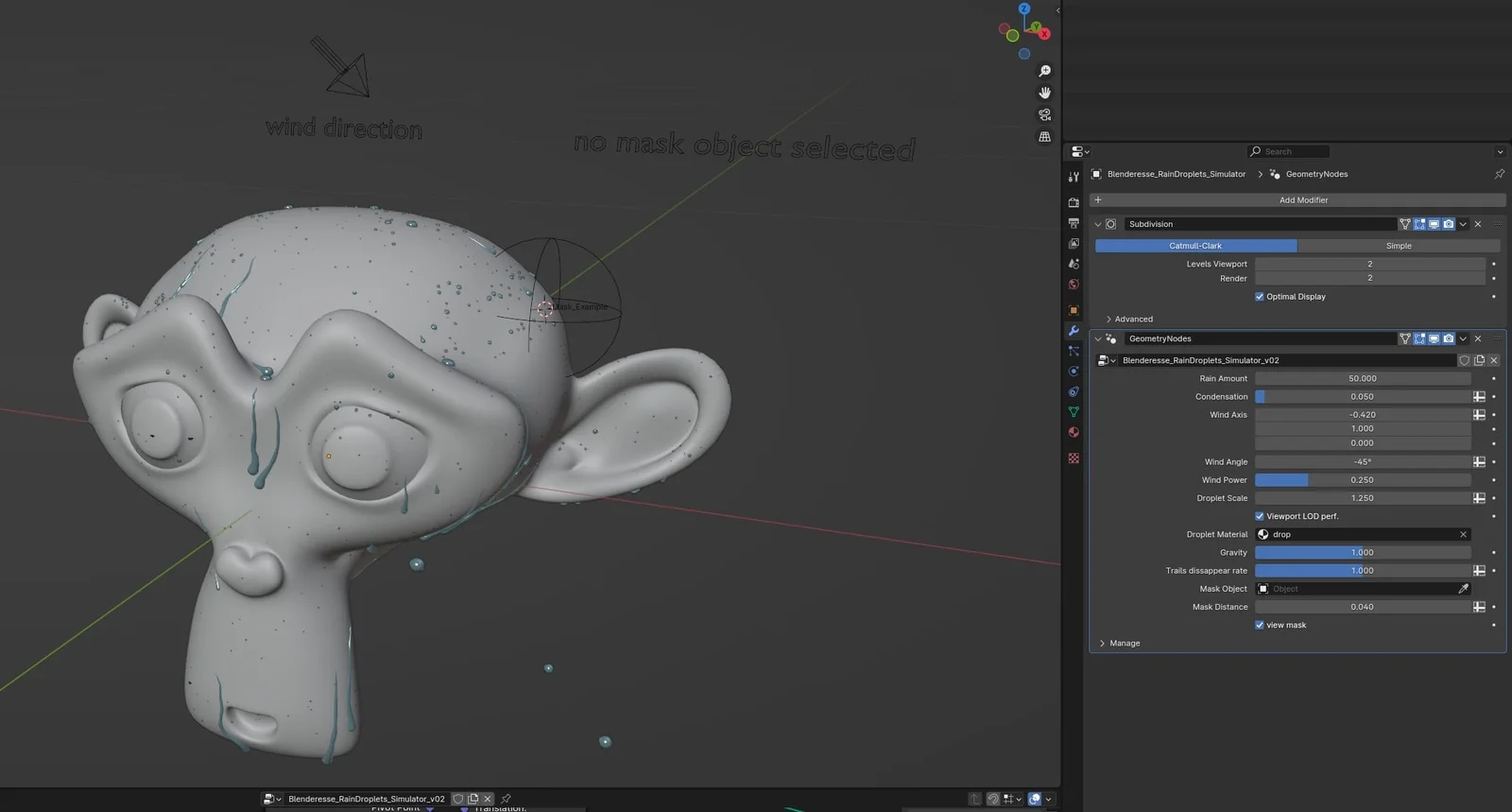 This geometry nodes setup generates simulated rain droplets and condensation on static 3D objects. It allows users to control gravity, modify trail lengths, and mask droplet generation using other objects. The simulator ensures droplets sit flush against meshes without clipping through the underlying surfaces to maintain realistic water shading.